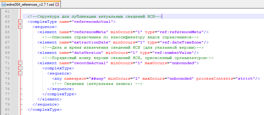 Схема паспорта транспортного контейнера с актуальными сведениями НСИ находится в файле iedms004_references_v2.7.1.xsd из состава ТК НСИ (начало описания структуры ответа на запрос справочника обозначено комментарием <!--Структура ответа "Отправка нормативно-справочной информации"-->, начало описания структуры актуальных сведений справочников НСИ обозначено комментарием <!--Структура для публикации актуальных сведений НСИ-->) (Рисунок 3.4).